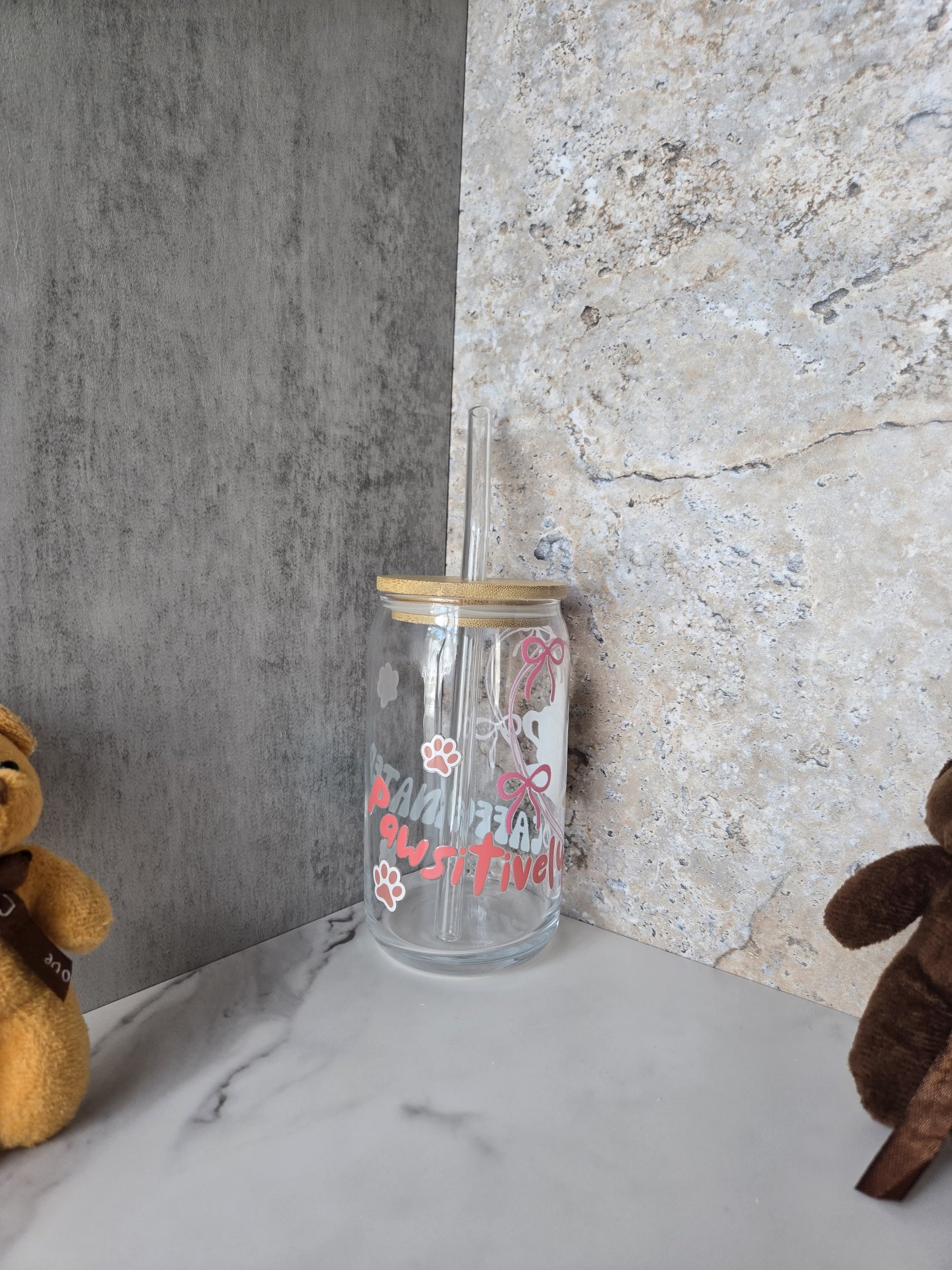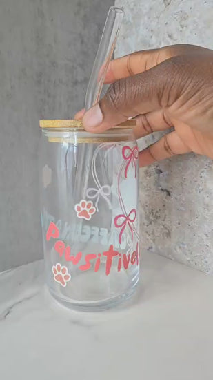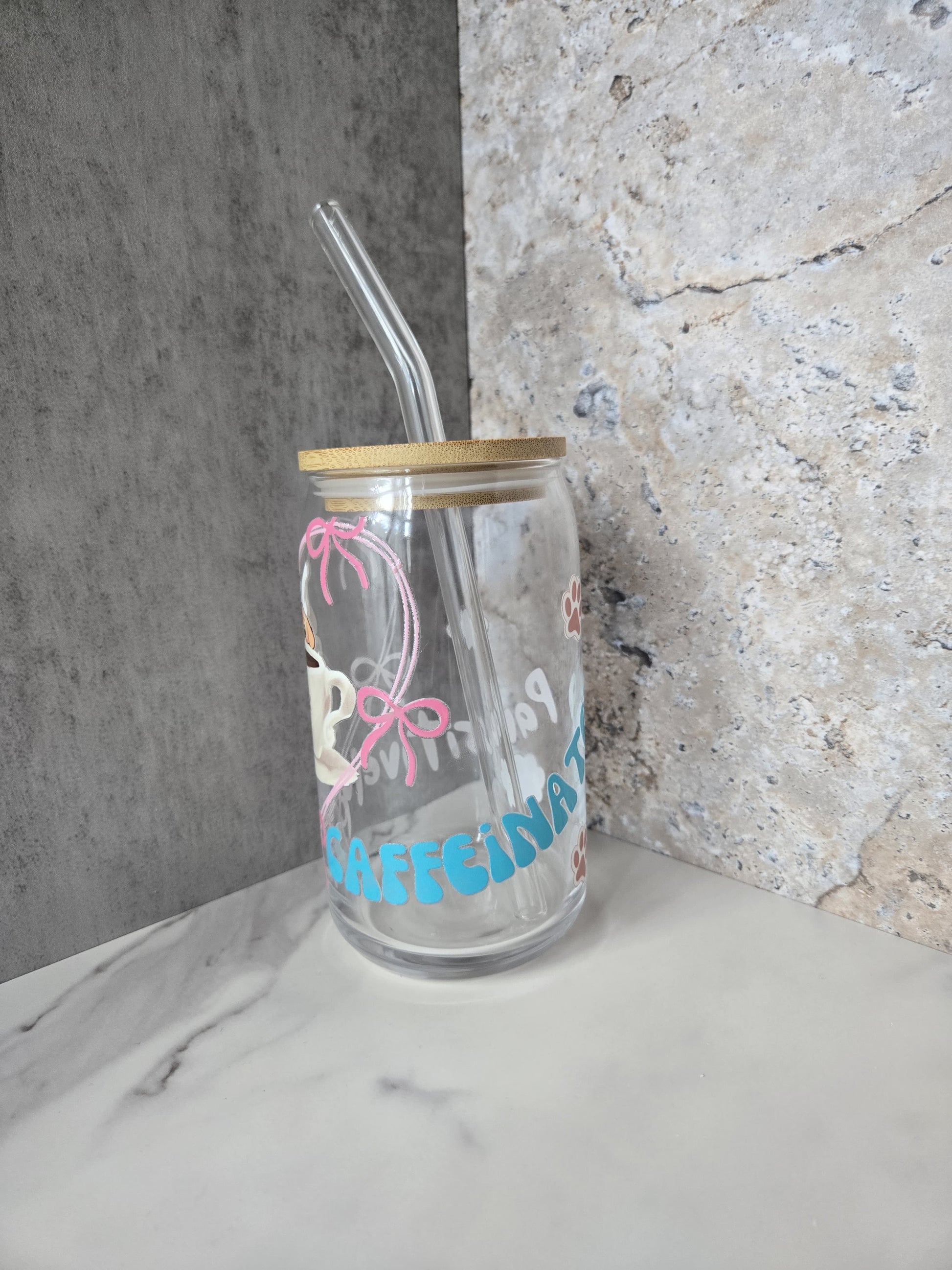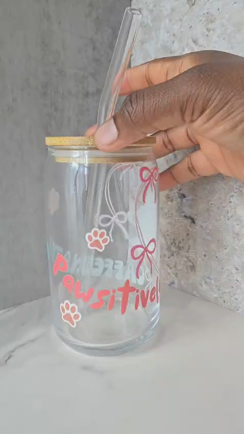 Sip in style with this pawsitively adorable 16 oz glass tumbler! Featuring a cheerful design for pet lovers and go-getters alike, it comes with a matching glass straw and is printed using UV DTF for a vibrant, long-lasting finish.